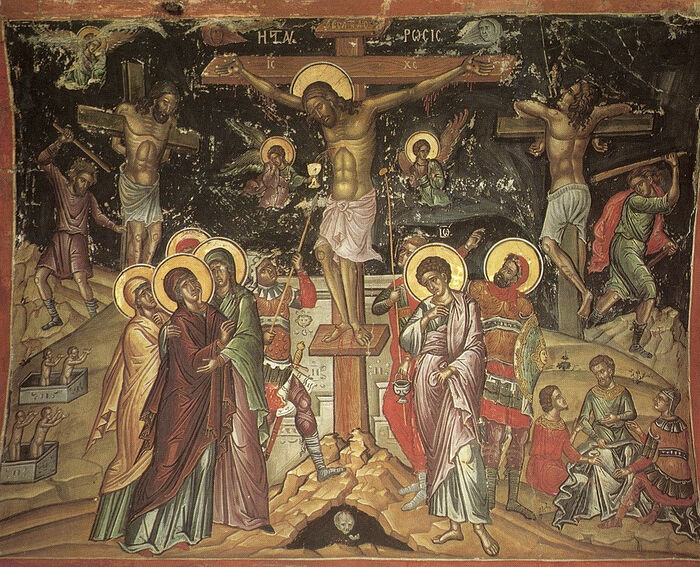 И вот, муки блекнут. Разбойник на кресте исполняется тихой радости, ибо свет распятого Солнца согрел его душу. Скоро ему перебьют голени. Он всё еще страждет, но смысл этих страданий он понял, познал – и потому нет ни тени озлобленности, ни отчаяния. Меру его грехов принял Тот, Кто понес на Себе и наши с тобою грехи.